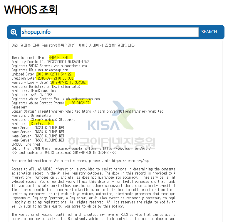한국 인터넷진흥원에서 제공하는 후이즈 검색에서 이메일의 도메인인 shopup.info 를 검색해 보면, 2018년 7월 12일에 누군가가 도메인 사용권한을 얻었고, 2019년 4월 2일에 도메인에 관련된 정보(네임서버 등)가 바뀌었다고 나온다.