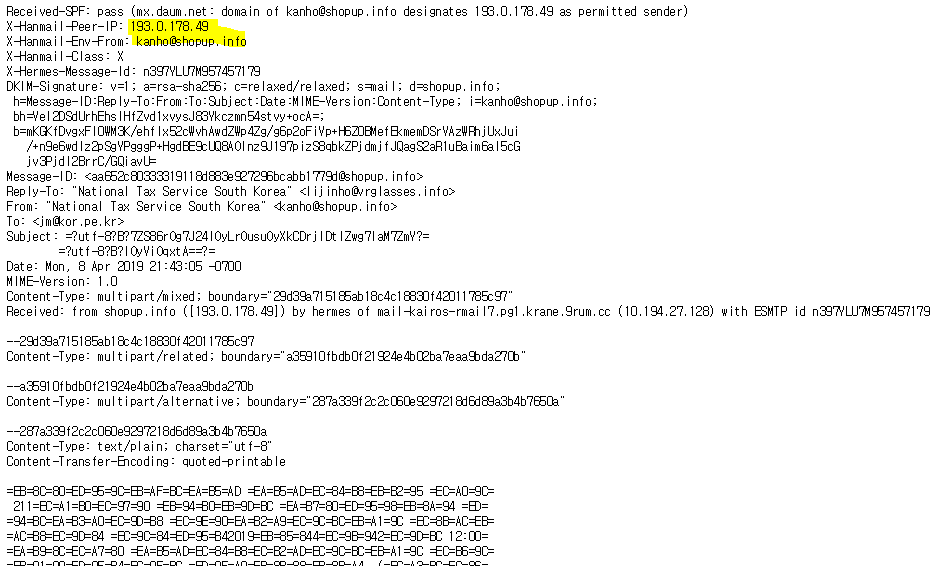 한메일에 있는 메일 원문보기를 하면 메일을 발송한 사람의 IP 주소를 확인할 수 있다.