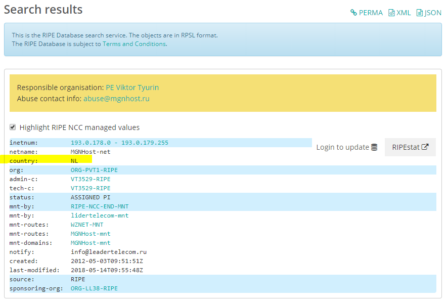 RIPE(https://www.ripe.net/) 에서 해당 IP 를 조회해 보니 네덜란드에 할당된 IP 주소라는 것을 알 수 있다.