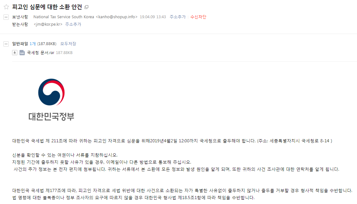 대한민국 정부인척 하면서 RAR 압축파일을 첨부파일로 보냈다. 4월 2일 까지 출두해야 한다고 하면서 메일은 4월 9일에 발송했다.