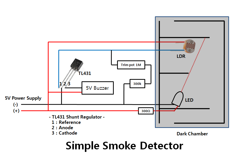 LED 의 빛은 중간의 칸막이에 가려서 CdS 에 직접적으로 비춰지면 안된다. 평상시에는 CdS 에 빛이 도달하지 않다가, 연기가 유입되어 LED 의 빛이 산란되면 CdS 에도 빛이 가해지게 되어, 낮아진 저항을 회로에서 감지하여 알람이 울리는 방식이다.