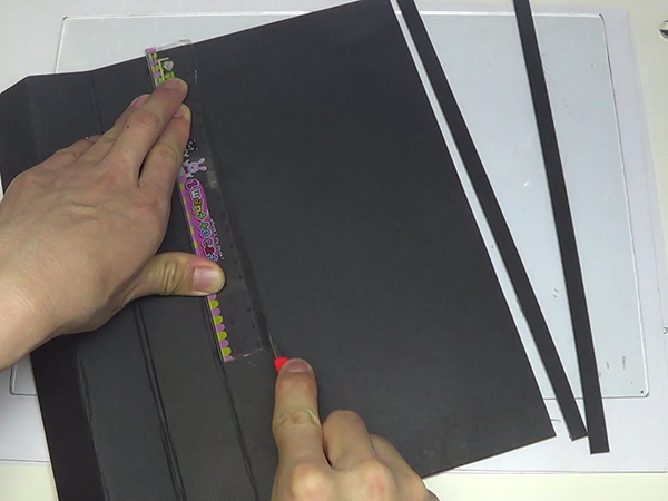 탁상용 달력 등에 붙어있는 검은색 하드보드지를 이용하였다. 1cm 폭으로 자른 것은 벽면으로 하고, 크게 자른 것은 윗판과 아래판으로 이용할 예정이다.