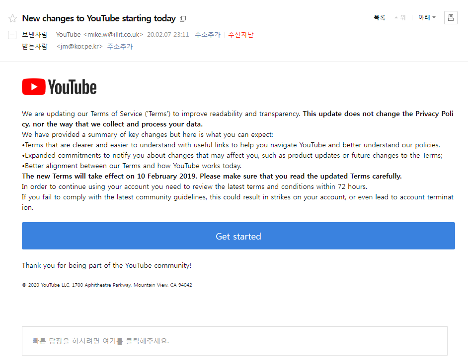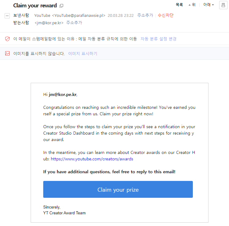 3. 유튜브에서 공식적으로 보내는 메일은 지메일로 받고, 기타 비지니스 관련 메일은 지메일이 아닌 다른 계정에서 받도록 설정해 두면, 타 계정(비지니스용)에 유튜브 어쩌고 하는 메일이 온 경우 100% 가짜이므로 바로 삭제하면 된다.