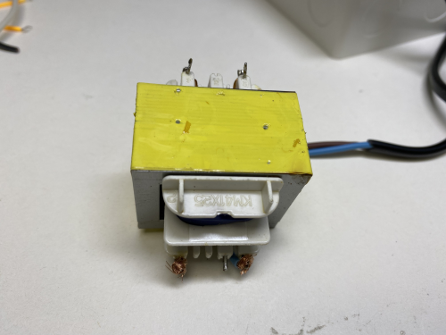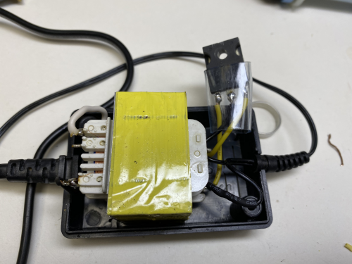 5V 정전압 어댑터에서 빼낸 변압기이다. 7805 를 이용하여 5V 정전압을 만드는 방식이었으므로 출력은 8~9V 정도 되었을 것이라 추정할 수 있다.
