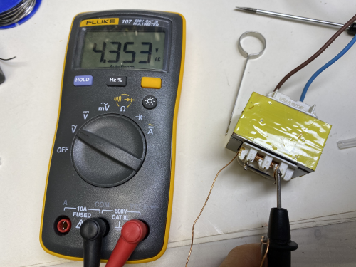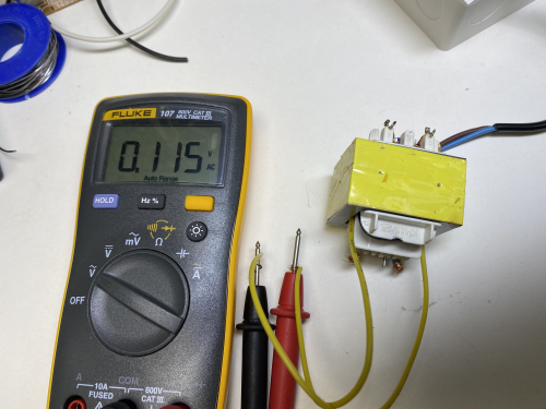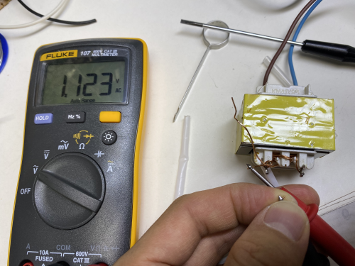 변압기의 빈 틈으로 전선을 한 바퀴 감아서 전압을 측정해 보니 0.115V 가 나왔다.