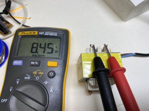 1차 측에 AC220V 를 가하니, 2차 측에 8.45V 가 생성되었다.