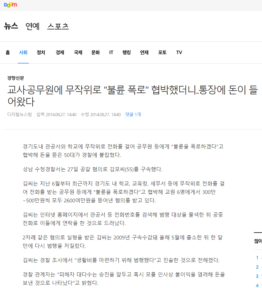 관공서 등에 무작위로 전화를 걸어서 불륜을 폭로하겠다고 전화를 해서 돈을 뜯어낸 사례도 있다.