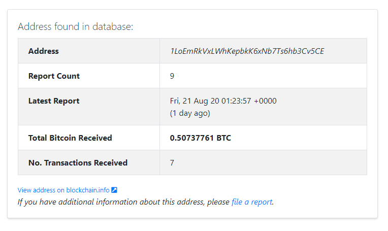 구글에서 비트코인 주소를 검색해보니 어뷰징 데이터베이스에 등록되어 있다.