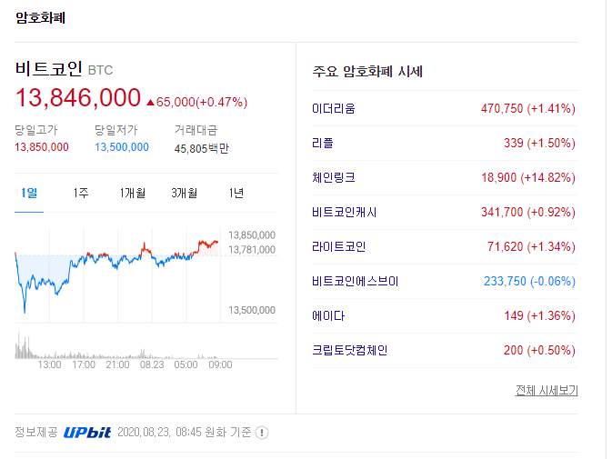 2020년 8월 23일 현재 비트코인 시세는 1300만원 정도이다.