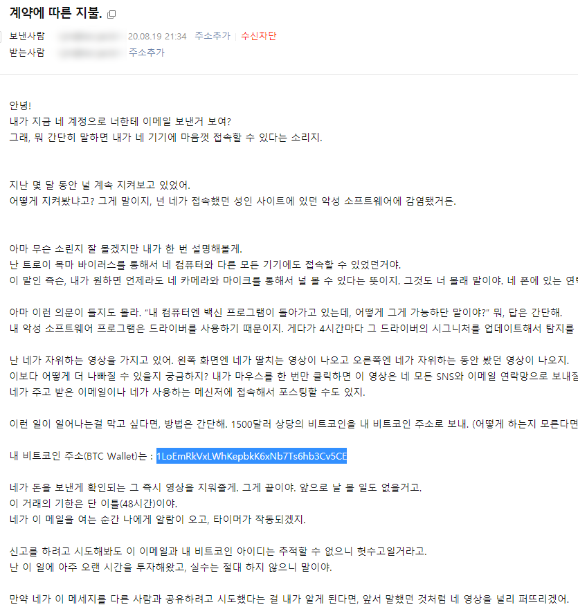 내용을 보면, 번역기를 돌린 듯한 내용이 있는데, 주된 요지는 해커가 사용자의 컴퓨터를 해킹했으며, 은밀한 정보를 주변 지인들에게 퍼뜨릴 것이다. 48시간 안에 지정된 곳에 비트코인을 보내지 않으면 퍼뜨려버리겠다. 라고 협박하는 내용이었다.