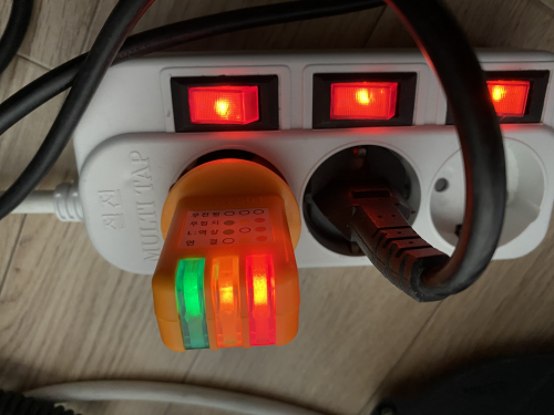 대한민국에서 사용하는 콘센트는 플러그를 돌려서 꽂을 수 있는 구조이므로 콘센트에 꽂았을 때, 방향에 따라 다르지만 램프 2개가 켜지면 접지가 제대로 된 상태라고 볼 수 있고, 세개가 모두 켜지면 접지가 되지 않은 콘센트라고 판별할 수 있다.
