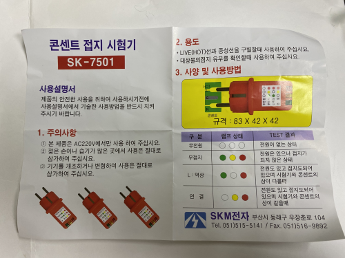 결론 : SK-7501 콘센트 접지시험기는 콘센트의 접지 여부와 전원투입 여부를 판별할 수 있지만, 단상 3선식 환경(오래된 아파트 등)에서는 콘센트의 접지유무를 판별하지 못한다.