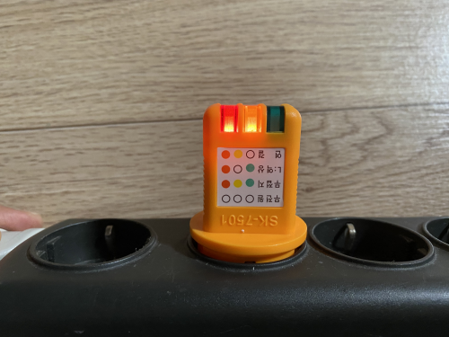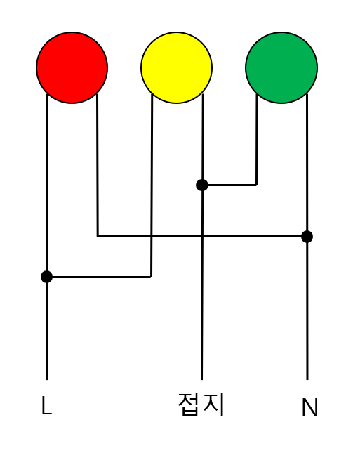 전원이 투입되면 적색 램프는 무조건 켜지게 된다. 하지만 황색 램프는 L 단자가 L 에 물렸을 때에만 전압이 걸리게 되어 정상적으로 꽂았을 때에만 켜지는 램프이다. L-N 이 반대가 되면 적색, 녹색 램프에만 전압이 걸리게 되어 양 끝단만 켜지게 될 것이다. (2개의 램프만 켜짐)