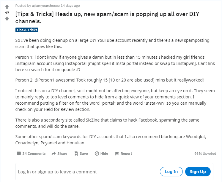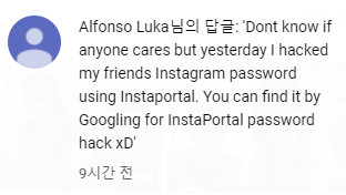유튜브 댓글에 무작위적으로 인스타그램 해킹툴을 홍보하고 있다.