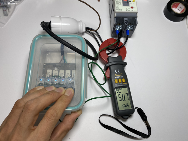 버튼 5개를 눌러서 50mA 의 누설전류를 발생시키니, 50.7mA 가 표시된다.