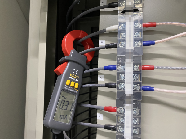 전원판넬에서 각 부하별 누설전류를 측정해 보았다. 전원판넬에서 해당 부하까지 200~300m 정도 되기 때문에 120V 의 저압에서도 누설전류가 0.3mA 가 발생하고 있었다.