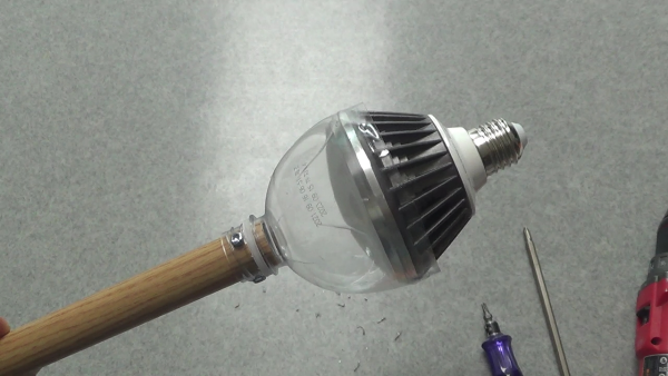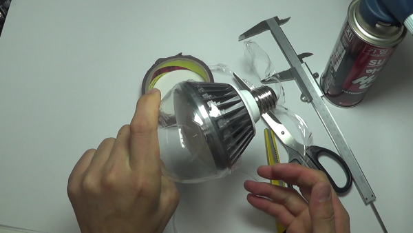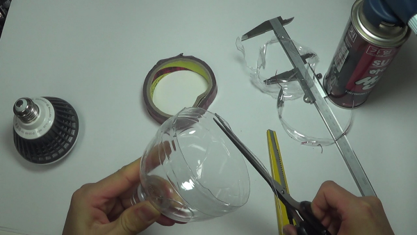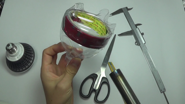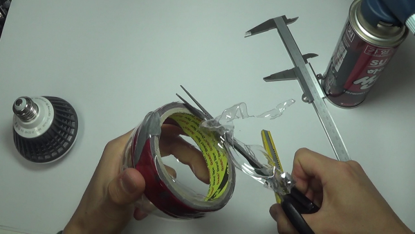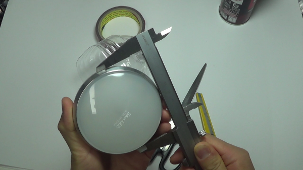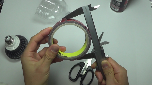 버니어 캘리퍼스를 이용하여 LED 조명의 지름을 잰다. 이 지름과 같거나 1mm 정도 더 큰 원기둥형 물체가 필요하게 된다.