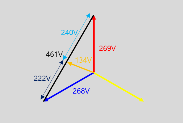 461V 는 1차측 선간전압이고, 268V, 269V 는 상전압이다. 3상 델타결선의 2가닥만 연결되어있기 때문에 노란색 부분의 전압은 알 수 없다.