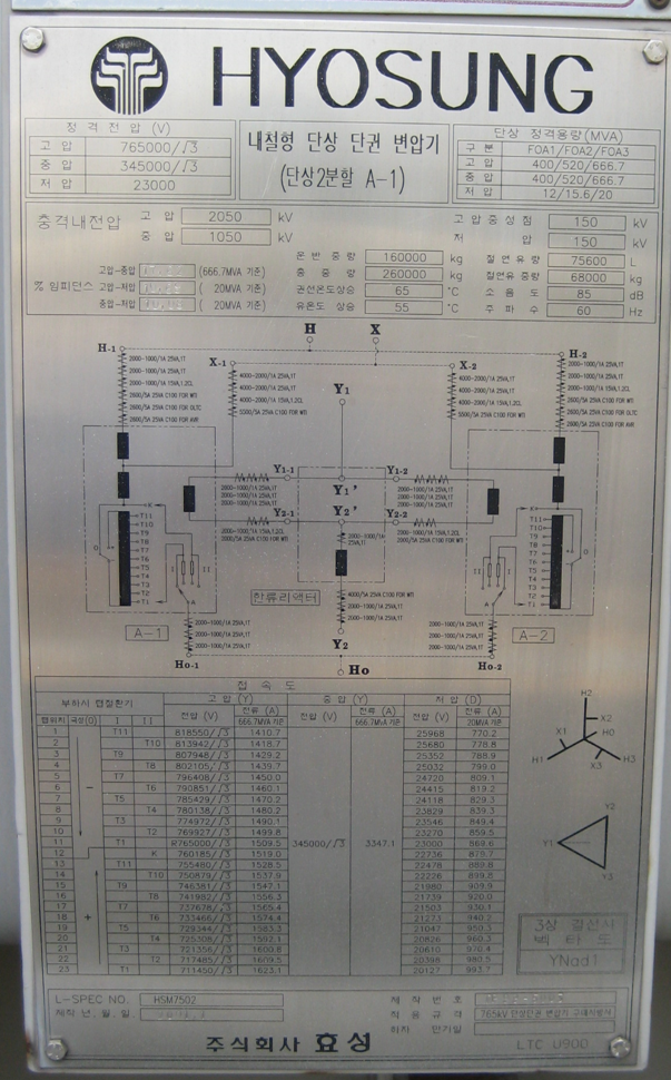 이 변압기에는 부하시 탭 절환기(OLTC, On Load Tap Changer) 가 설치되어 있어서 각 탭별 정격전압도 표기되어 있다.