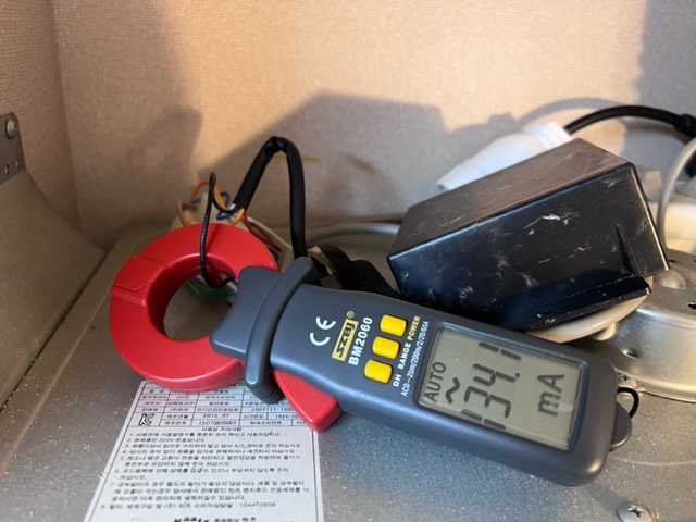 예전에 구입한 중국산 클램프메터(후크메터)로 전류를 측정해 보니 134mA 가 흐른다.
