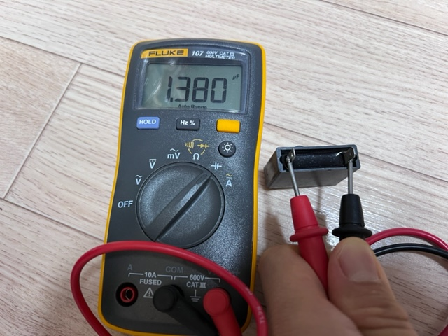 약 1.38㎌ 이 나온다. 용량이 약간 감퇴 되었지만, 이 정도로 기동이 안되거나 하진 않는다. 콘덴서가 고장난 경우, 정상 용량의 10% 이하 수준이 나온다.
