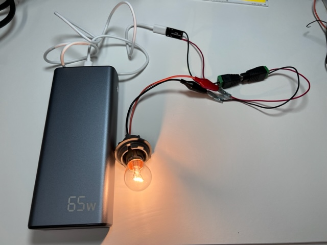 먼저 12V 21W 자동차 전구를 연결해 보았다. 밝게 잘 켜진다.