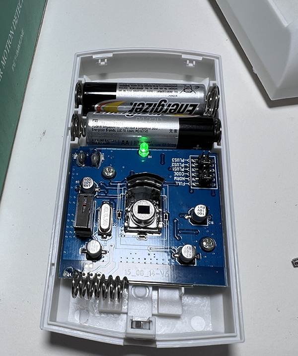 커버를 분리하면 내부에 AA 건전지 2개를 끼우도록 되어 있다. 건전지를 끼우면, 사람을 감지했을 때 LED 가 깜빡인다.