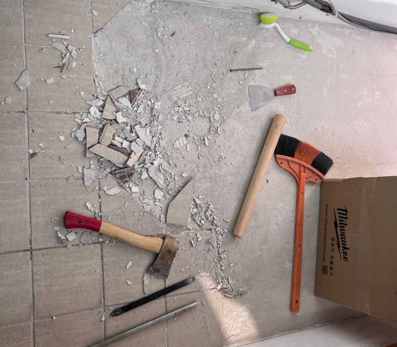 본격적으로 타일을 깨기 시작했다. 집에 적당한 도구가 없어서 스테인레스 환봉과 손도끼, 킥보드 타이어를 장착할 때 썼던 타이어 레버를 이용하였다. (지금은 팔아넘기고 없는 킥보드에 사용하던 것이라 본래 용도로 활용할 일이 더 이상 없었다.)