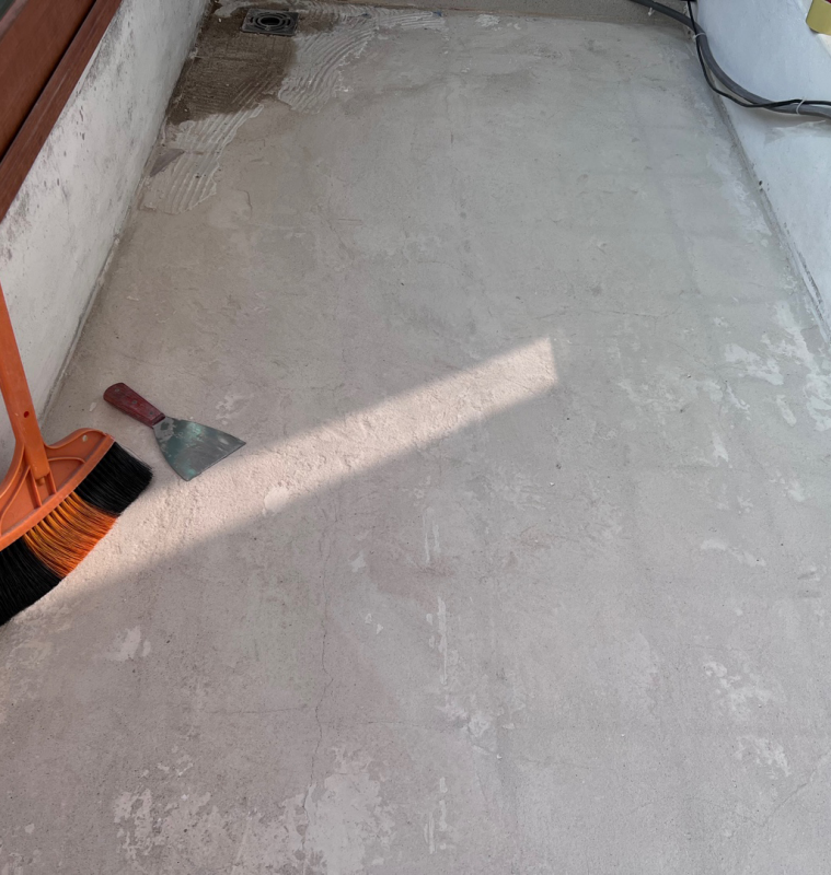 타일을 제거한 상태에서는 바닥으로 물이 스며들어서 아래층에 피해를 줄 수 있으므로 물을 장시간 뿌리고 있으면 안 된다. 과거 타일 물매 불량으로 인해 상습적으로 물이 고였던 부분에는 어김없이 물이 고여있다.