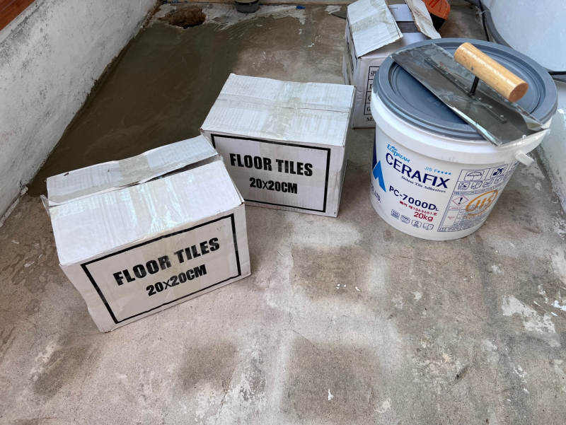 나중에 알게 된 사실인데, 이러한 타일 본드는 벽 타일을 붙이는 데 사용되고, 물이 묻으면 다시 떨어지게 되며, 굳는데 10일 이상 걸리게 되므로 물기가 있는 바닥에는 사용하면 안되는 것이었다.