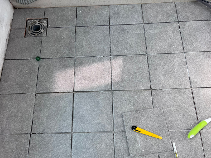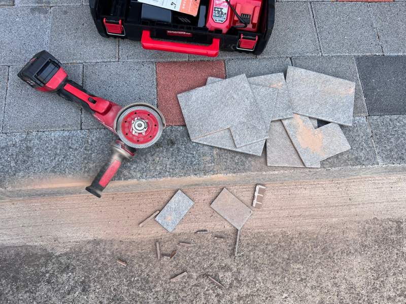 유가(하수구 구멍) 주변은 타일을 잘라서 이어 붙어야 한다. 타일커터 등을 이용할 수도 있으나 전문업자처럼 다량의 작업을 할 것이 아니어서 밀워키 무선그라인더와 타일커팅날을 구매하여 타일을 잘랐다.
