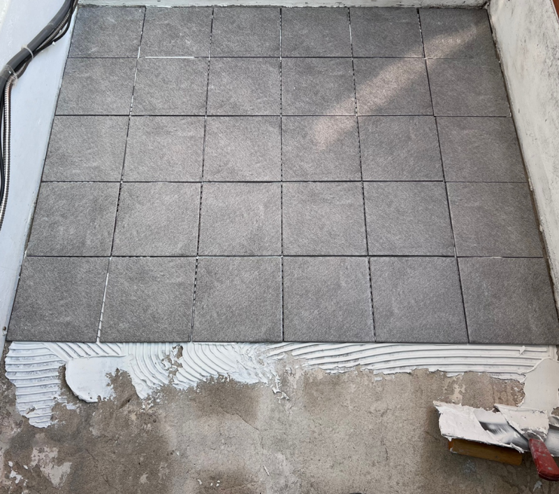 타일흙손으로 타일본드를 바르고 난 후, 타일을 차근차근 붙여준다. 이 본드를 칠한 후, 20분 이내에 타일을 붙여야 한다고 되어 있다.