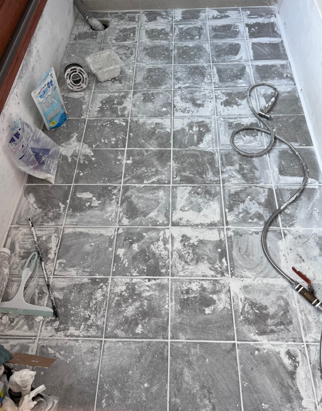 백시멘트의 점도를 죽 정도로 맞춰주면, 시간이 가서 타일과 바닥으로 수분이 흡수되면서 딱딱하게 굳었다. 5분 정도만 지나도 딱딱해져서 위로 걸어 다닐 수 있는 정도였다. 진작 이걸로 할걸..