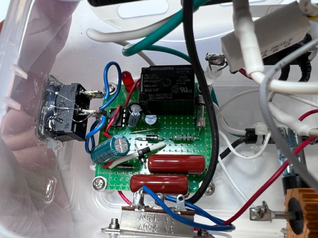 아래에 있는 두 콘덴서는 1㎌ 콘덴서이다. 두 개는 직렬로 연결되어 있으며, 전압선택 스위치에 따라 115V로 선택한 경우 하나의 콘덴서는 단락 되어 트랜스리스 회로 측에 2배의 전류가 흐르도록 해 준다.