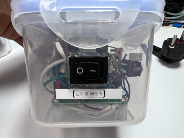 다이소에서 1000 원에 판매하고 있는 반찬통을 활용하여 일정 주기로 부하를 개폐해 주는 장치를 만들어 보았다.