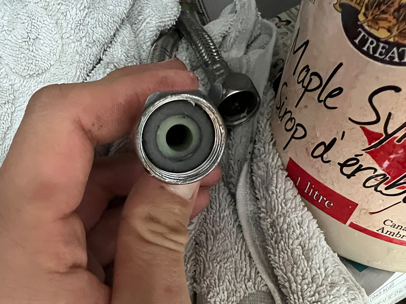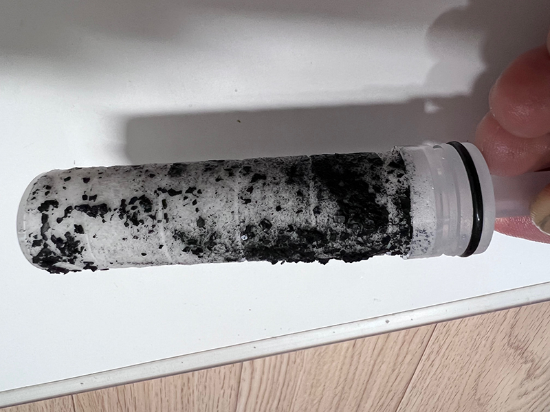 욕실에 있는 비데 필터를 잘라서 내부를 확인해 봤더니 검은 가루가 없어서, 부엌쪽 싱크대 배관 내부에서 흘러들어오는 것이라고 추정할 수 있었다.