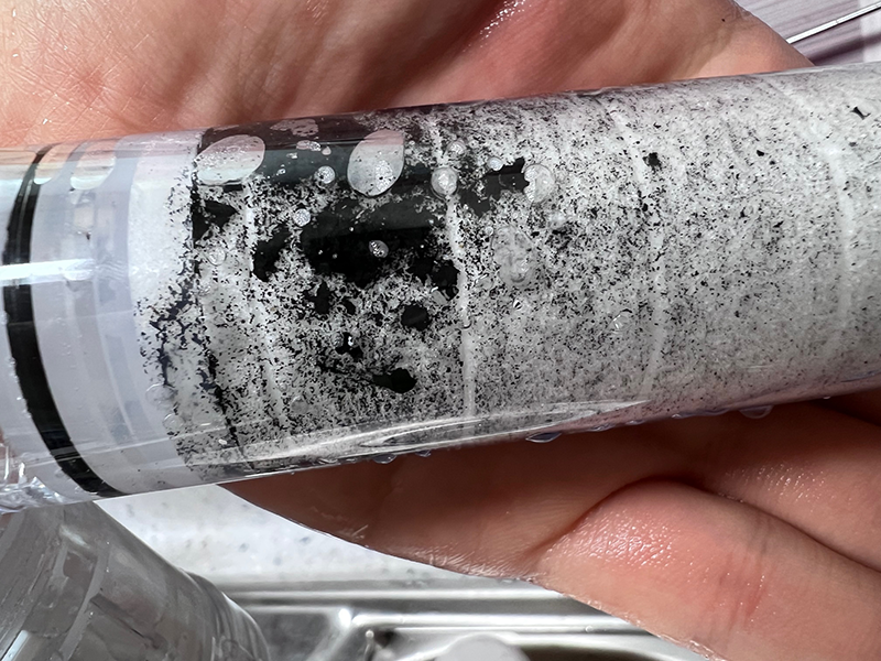 꺼내서 살펴보니 검은 가루는 수도관 내부의 고무 패킹이 삭아서 떨어져나온 것으로 추정되었다. 손으로 문지르면 쉽게 부스러졌고, 고무 냄새가 약간 났다.