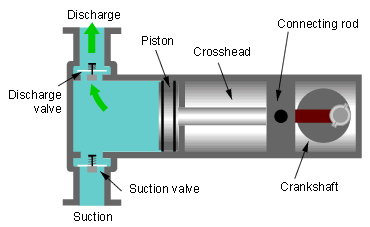 마치 주사기와 닮은 피스톤은 왕복운동을 하면서 내부 부피가 커질때는 아래 체크밸브가 열려서 물이 딸려 들어오고, 내부 부피가 작아질 때에는 위쪽 체크밸브가 열려서 토출관으로 물이 나가는 원리이다.