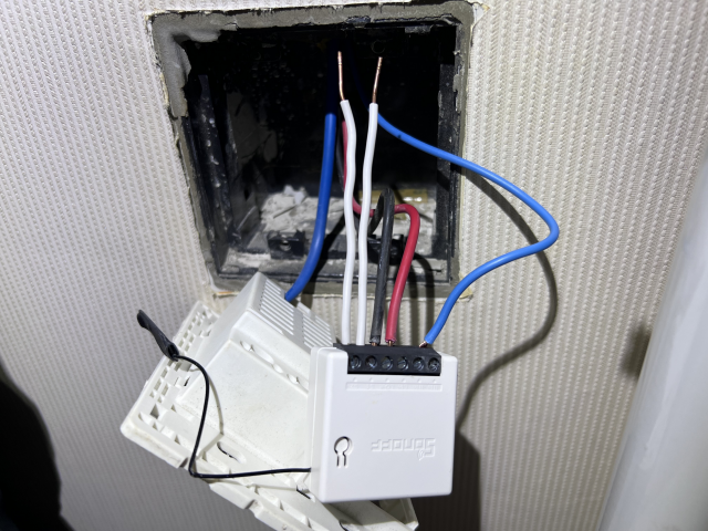 스위치박스측에서는 기존 스위치와의 연결을 해제하고, Sonoff mini 의 접점을 통해서 전등이 컨트롤되도록 한다.