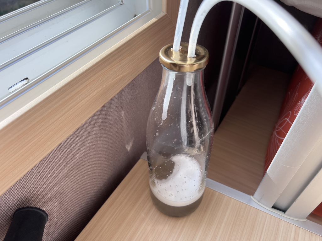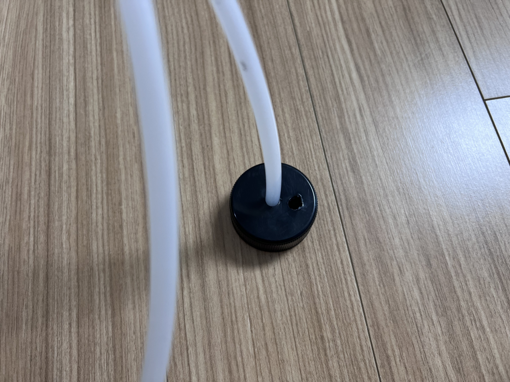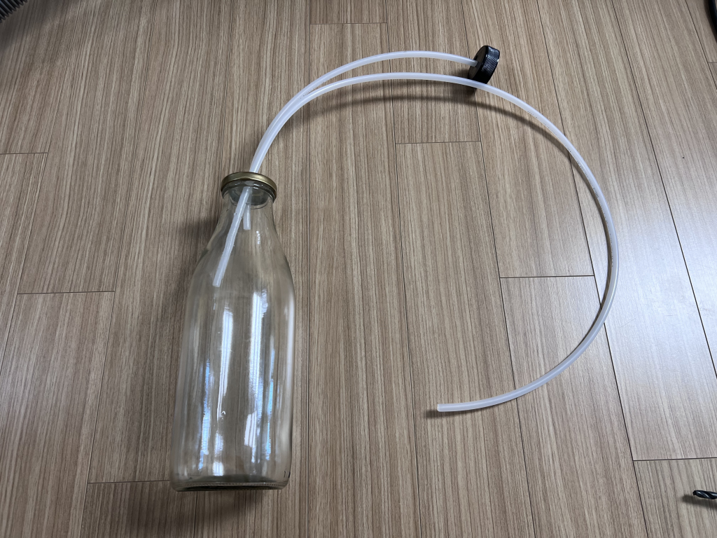 검은색 플라스틱 뚜껑 부분에 청소기의 노즐을 연결한 후, 청소기를 아주 약하게 켜 주면 병 내부가 음압이 되어 나머지 호스로 물을 빨아들일 수 있게 된다.