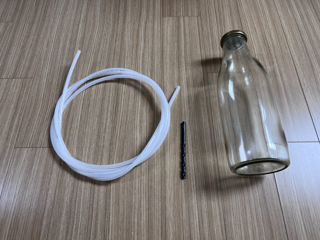 ○ 필요한 재료 : 유리병, 정수기호스(6.3mm), 플라스틱 우유병 뚜껑, 드릴, 드릴날 6mm