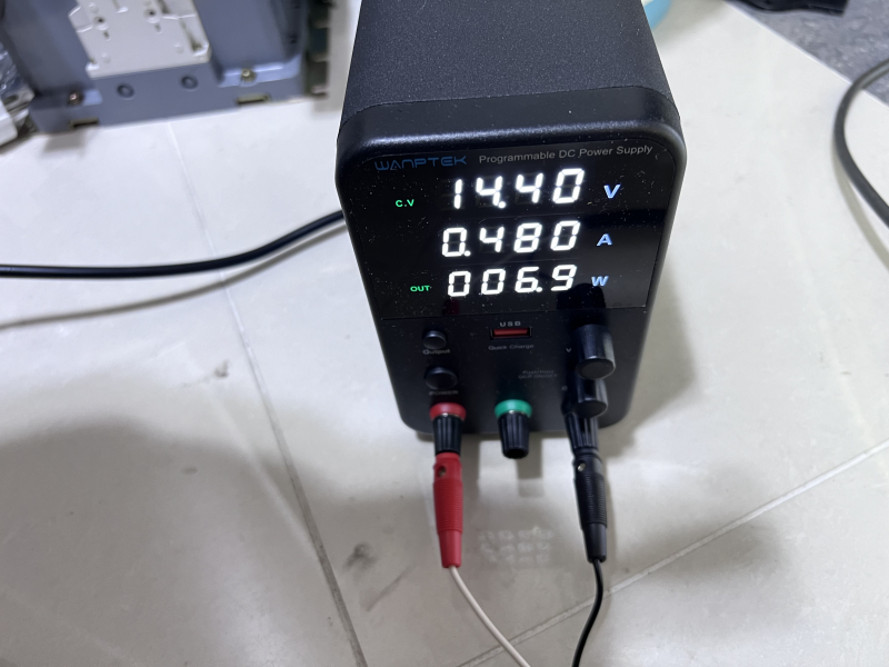 DC 파워서플라이의 전압을 14.4V 로 맞추고, 배터리 충전을 진행하였다.