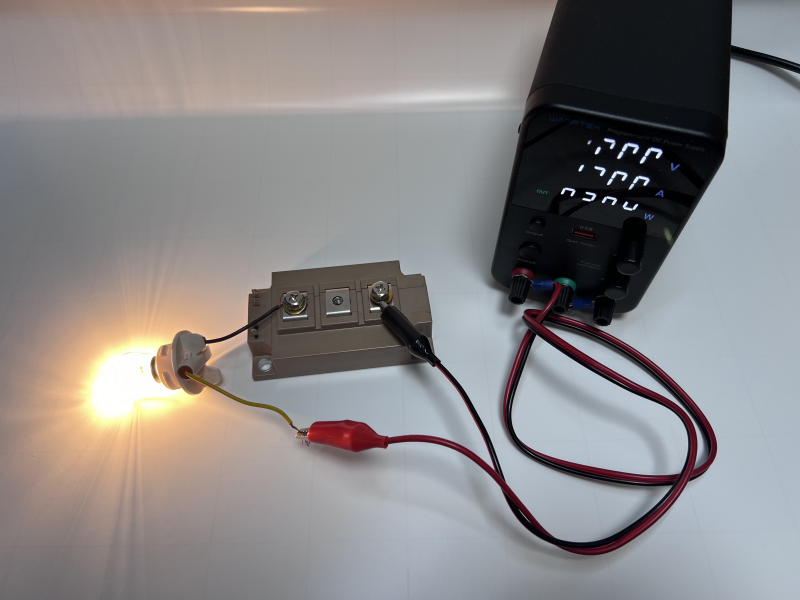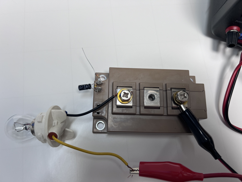 정전압 전원장치의 전압을 12V 로 맞추고, E1 에는 (-)극, (+) 극에 전구를 연결하여 C1 에 연결하고, (+) 극과 G1 을 손으로 잡으면 인체의 저항으로 인하여 전류가 흐르게 되고 G1 이 충전되면서 IGBT 가 도통이 되어 전구가 켜지게 된다.